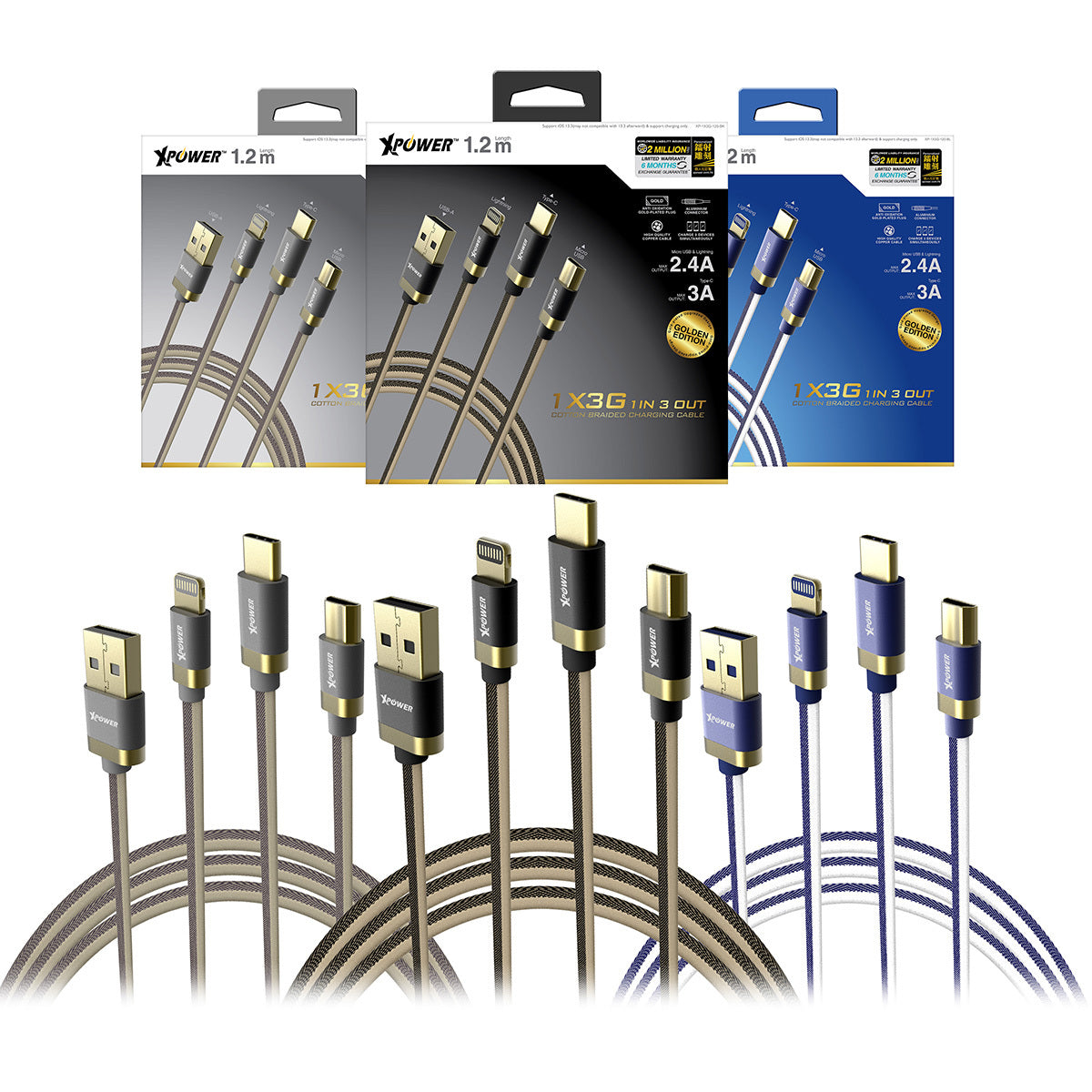 •3合1: Lightning, Type-C & Micro USB •1出3: 3裝置同時充電 •支援最大5V/3A(Type-C) 或 5V/2.4A(Lightning&Micro USB) 高速充電 •抗氧化鍍金物料 •耐用鋁合金 •無氧純銅線芯 •防撕裂編織線殼• 產品功能的可用性或會因應不同裝置而異 • Available functions may vary depending on the device