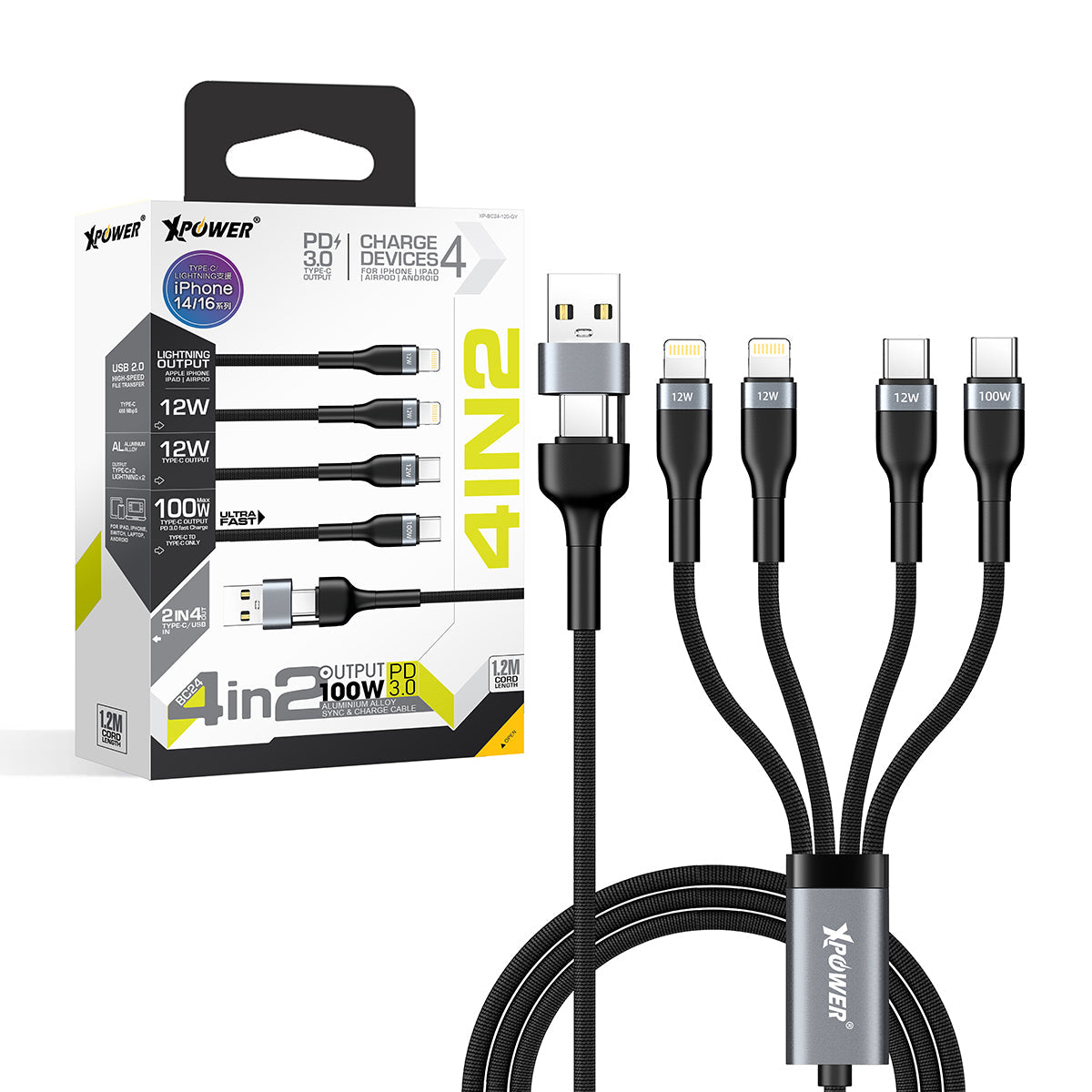 •8合1: Type-C+USB-A輸入, 2xType-C+2xLightning 輸出 •2出4: 4裝置同時充電,總輸出達100W (12W+88W) •支援最大100W PD 3.0高速充電(C>C) •支援高速檔案傳輸USB 2.0 480 Mbps(只限Type-C) •高品質純銅線芯 •耐用鋁合金外殼 •強韌尼龍編織線身 •安全認證: CE FCC RoHS •長度: 1.2米