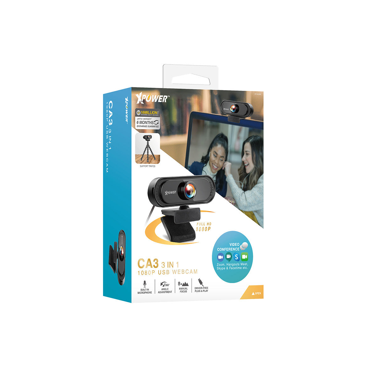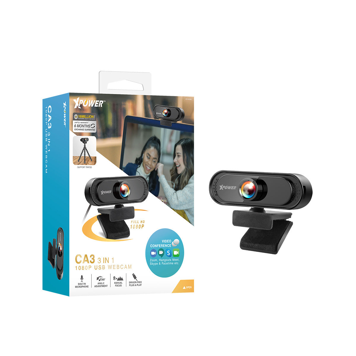 •支援視像會議: Zoom, Hangouts Meet, Skype等 •全高清1080P(1920x1080)30fps •超清晰廣角鏡頭 •高色彩還原度及自動弱光校正 •內置降噪咪高峰 •易於安裝即插即用 •支援水平和垂直角度調整 •可固定於三腳架、螢幕頂及桌面 •尺寸: 60x90x65(mm) & 96g