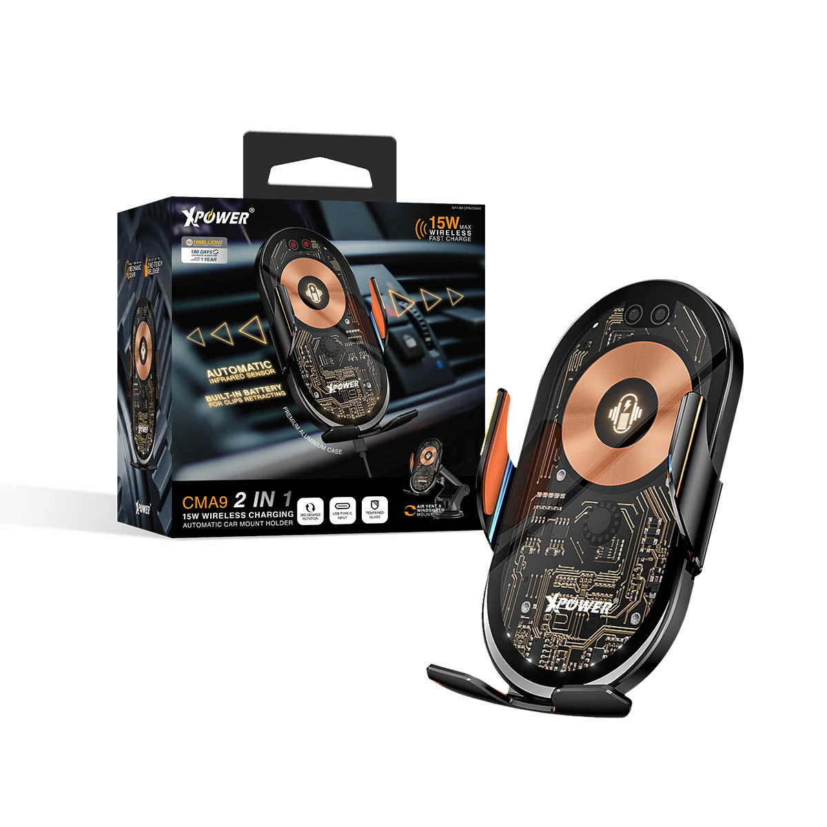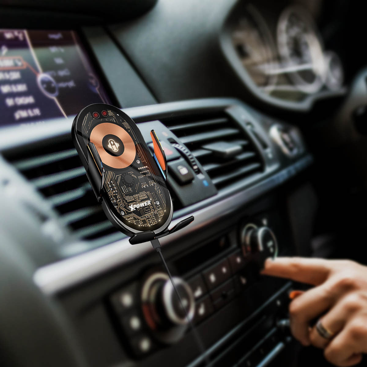 •紅外線感應自動鎖緊及輕按自動釋放 •支援15W無線快充 •2合1套裝:冷氣風口夾及玻璃吸盤 •自動調節手機夾,支援不同尺寸之手機 •360°旋轉設計 •防刮透明玻璃面及高級鋁合金外殼 •支援Type-C輸入 •內置電池,無需著車亦可釋放手機 •安全認證: CE,FCC,ROHS •支架尺寸: 122x68x45(mm) & 108g
