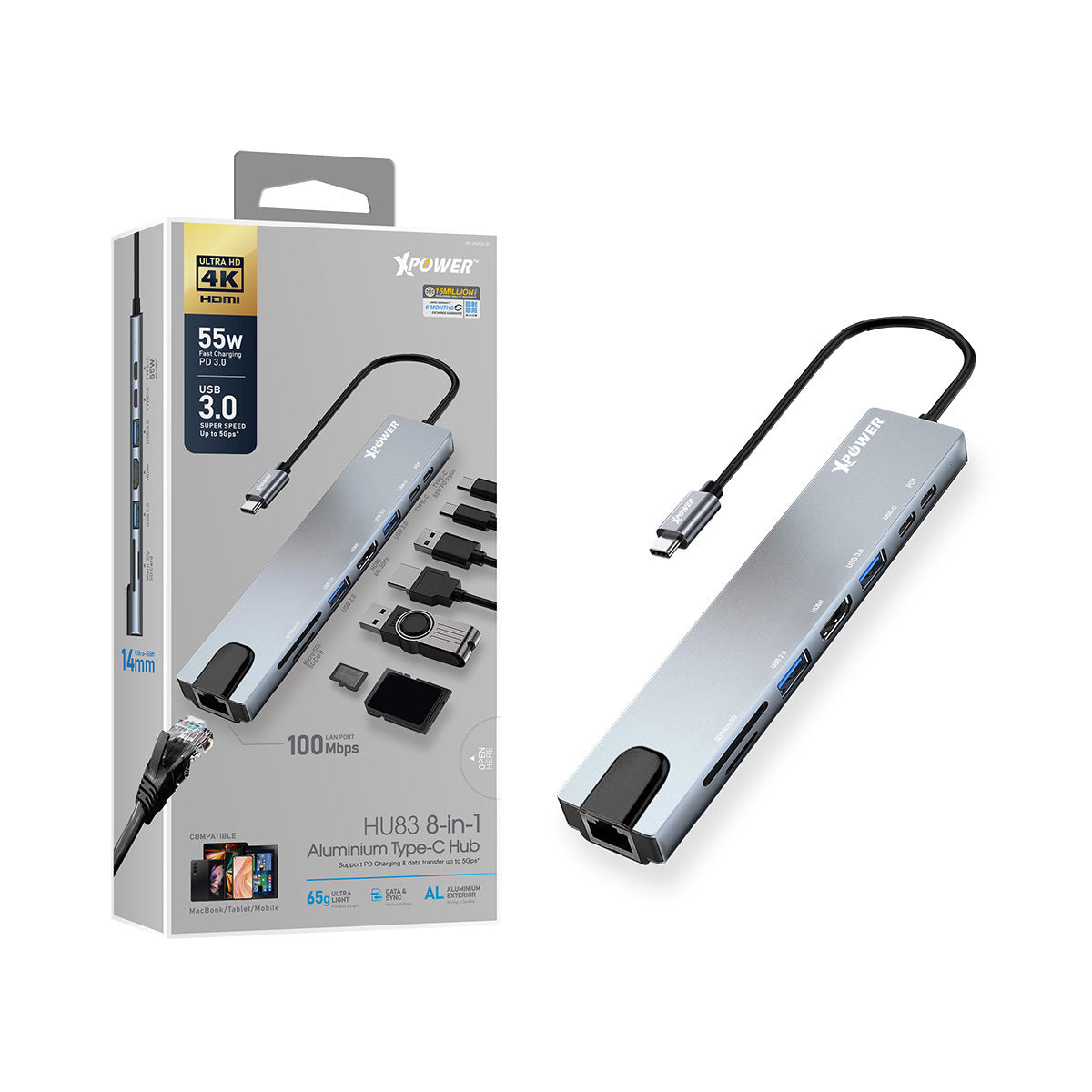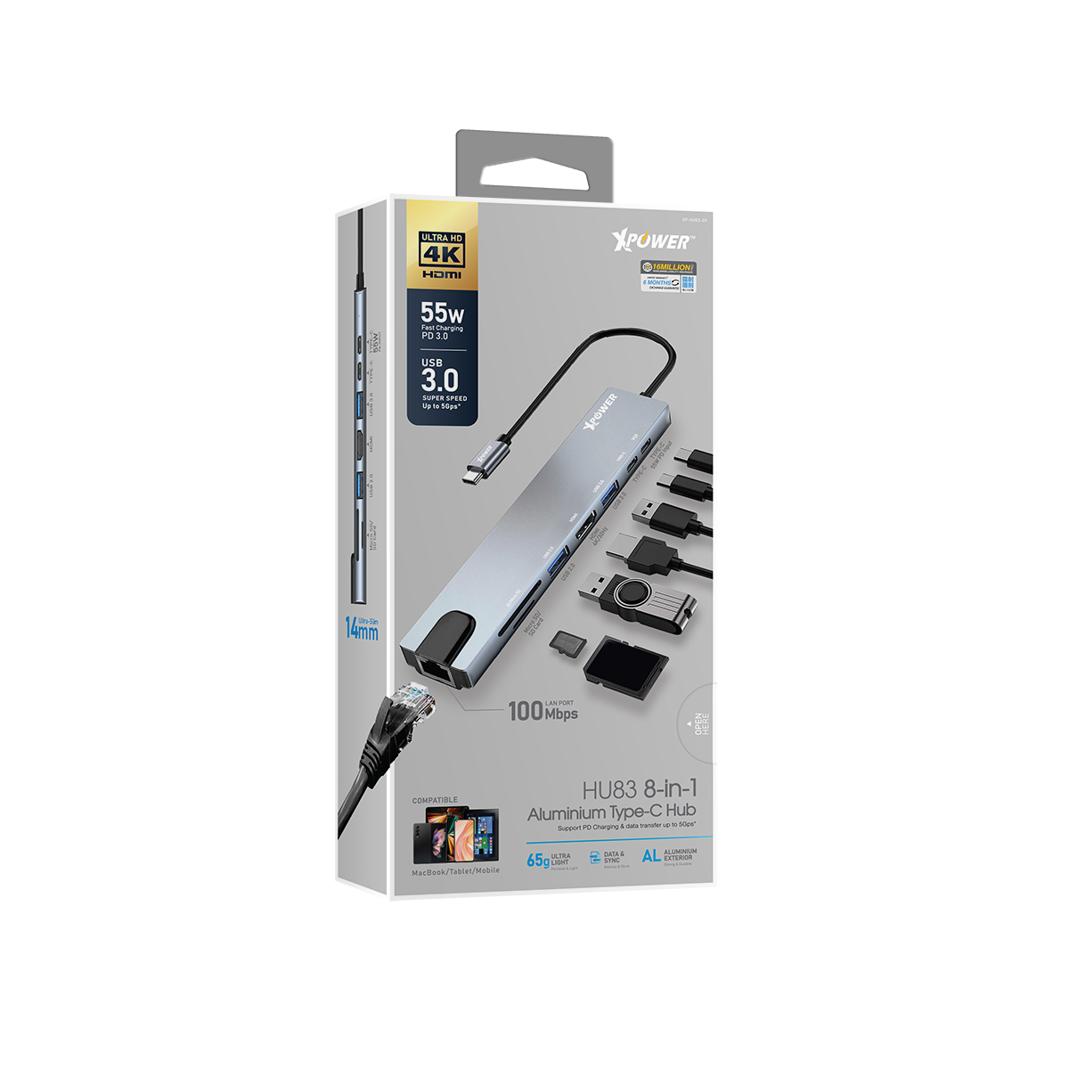 •8合1設計: TYPE-C 55W PD輸入, 100Mbps Lanport,� Micro SD/SD 讀咭器, USB 2.0, USB 3.0, HDMI 4K/30Hz, TYPE-C Data •HDMI 4K插槽及100Mbps Lan插槽 �•USB 3.0高速檔案傳輸,最大5GBps* •超薄設計,耐用鋁合金外殼,重量只有65g �•適用於MacBook、平板電腦和手機 •尺寸: 31 x 154 x 14mm & 65g •支援 TYpe-C 裝置, 功能的可用性或會因應不同裝置而異