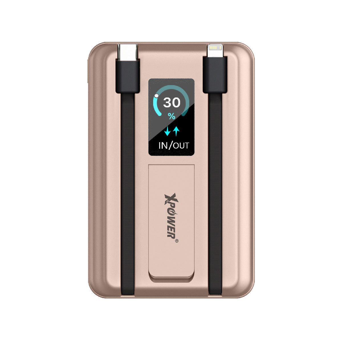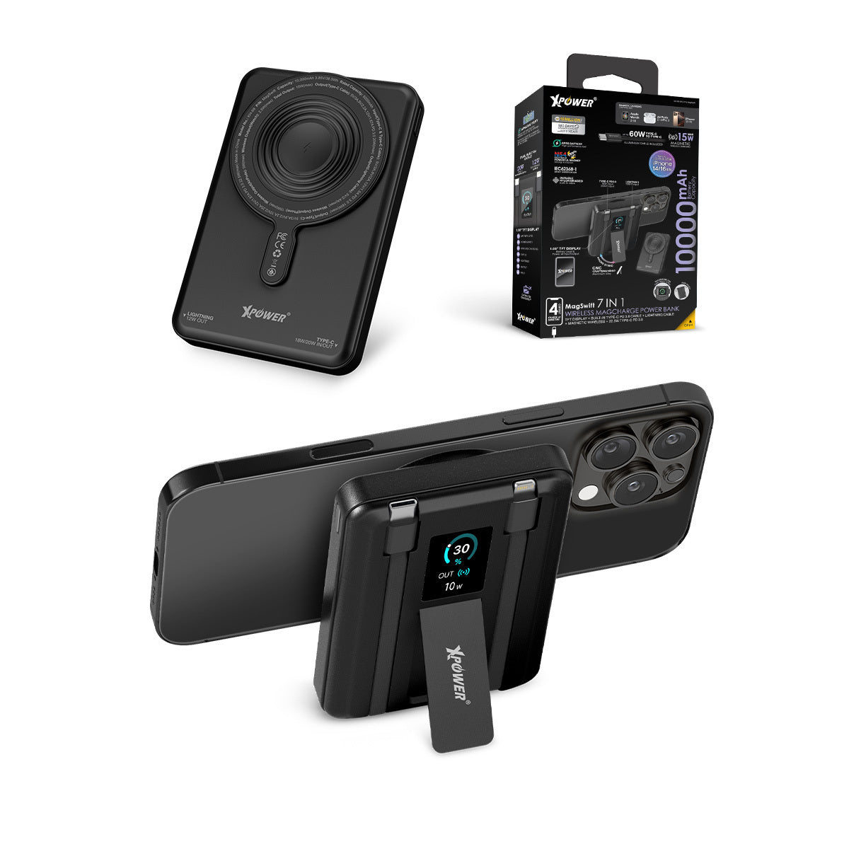 * 4x 輸出:15W磁吸無線充 + Type-C接口PD 3.0 22.5W + 2x內置線 (Type-C PD3.0 20W 及 Lightning 12W) * 輸入: Type-C接口PD 18W + Type-C內置線PD 18W * 10,000mAh大容量聚合物電池 * 1.08”TFT 顯示屏,顯示電量和輸入/輸出資訊 * MagCharge無線快充: 支援iPhone, AirPods, Apple Watch * 可快充iPhone 12-16, Pro & Pro Max, 大部份Android * CNC合金支架 * 尼龍編織內置線,堅韌耐用 * 安全認證, 優質可靠: FCC, CE, IEC62368-1 * 安全保護裝置: 過充/過放/過熱/過流/短路保護 * 尺寸: W70 x H107 x D19(mm) & 208g